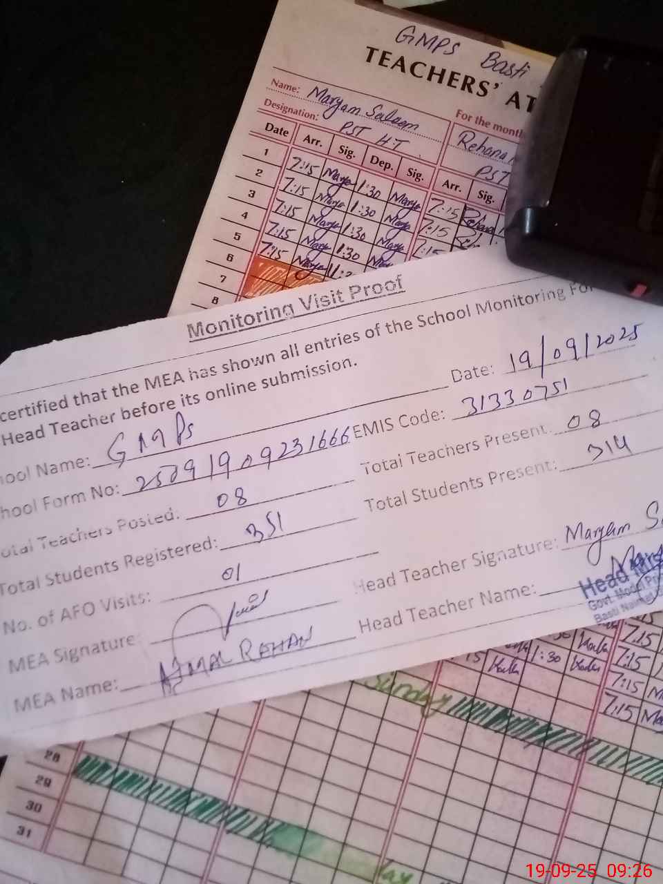 | Attendance Register | Head Teacher | MEA with School | Visit Proof |