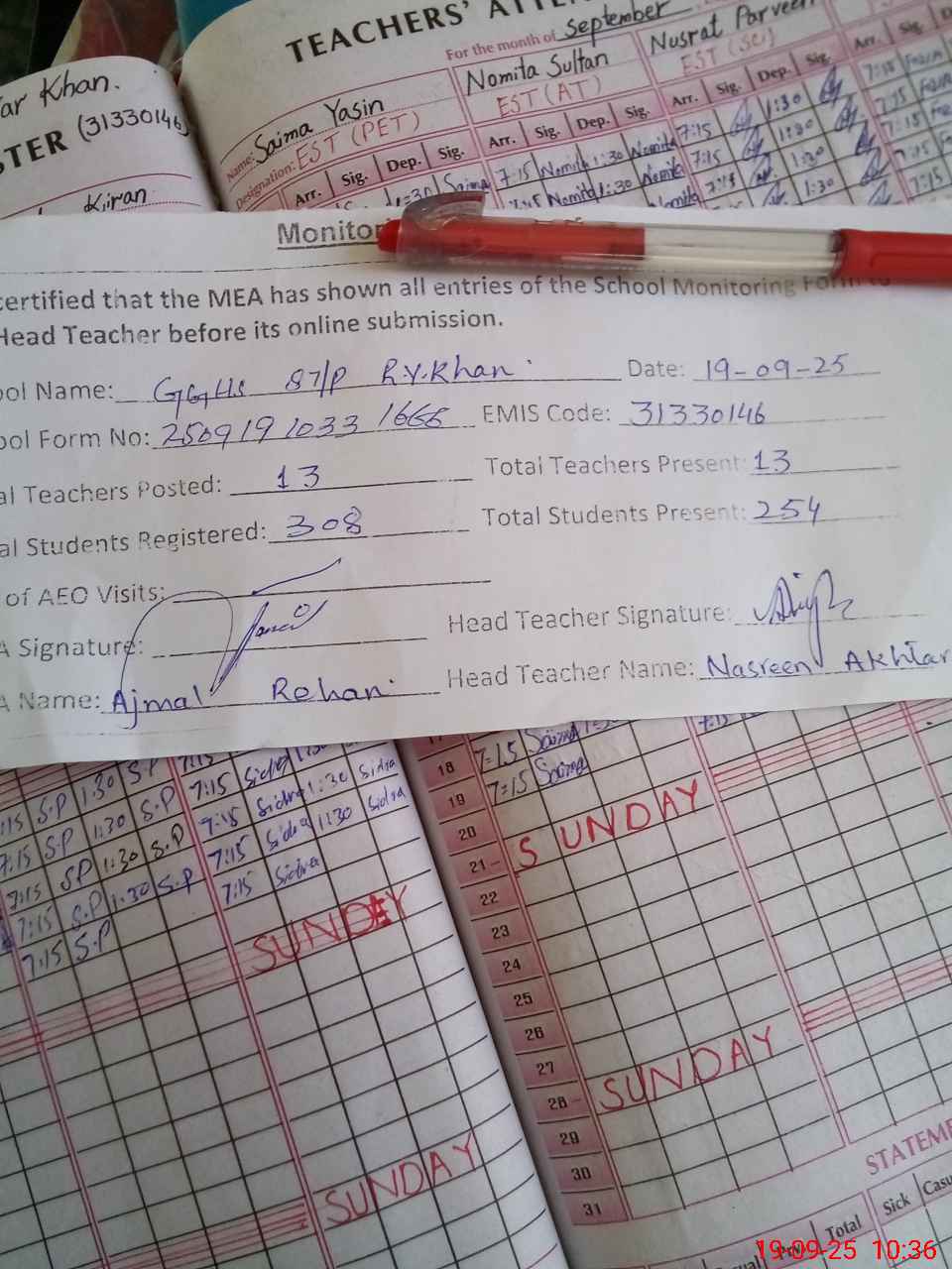 | Attendance Register | Head Teacher | MEA with School | Visit Proof |