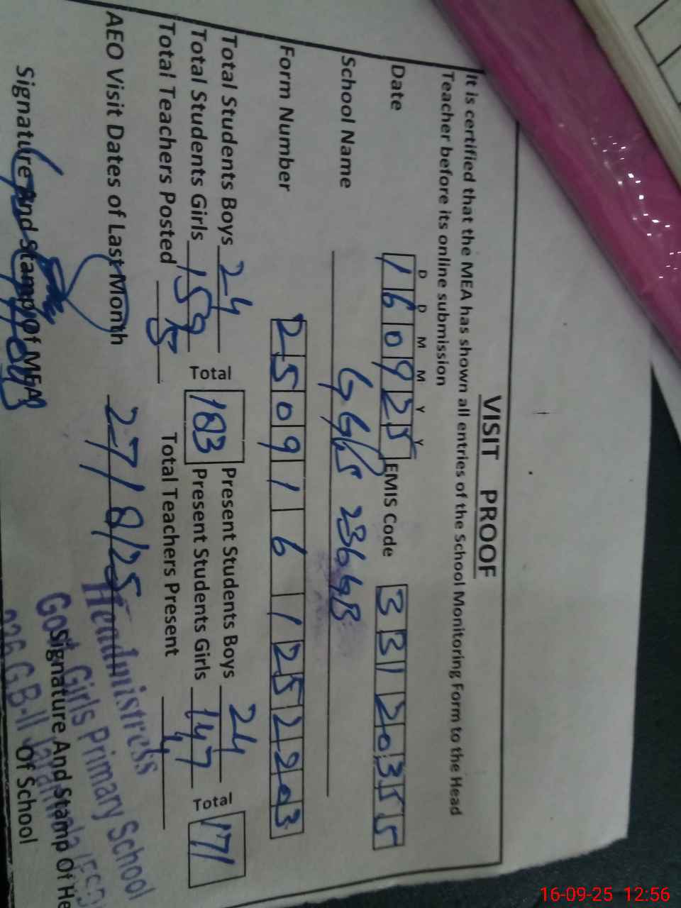| Attendance Register | Head Teacher | MEA with School | Visit Proof |