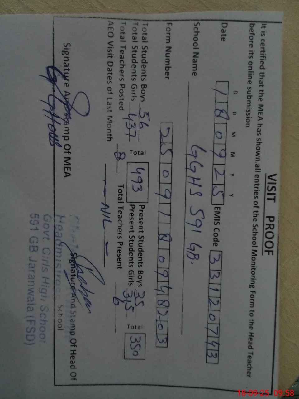 | Attendance Register | Head Teacher | MEA with School | Visit Proof |