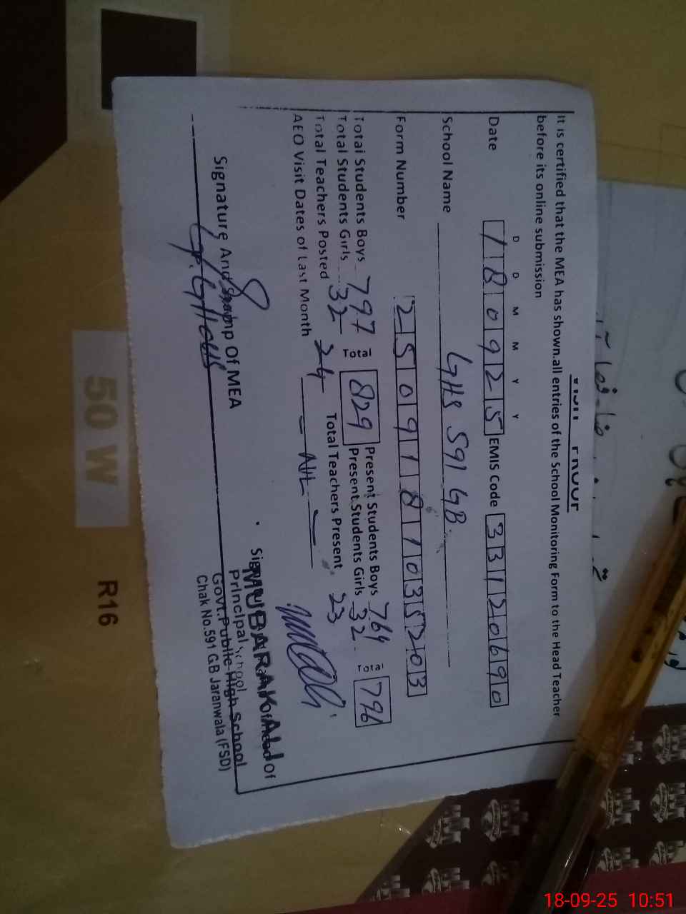 | Certified that this School was Inspected by the Undersigned MEA/DMO Today and the Information Stated Above is as Per Record. | |||||