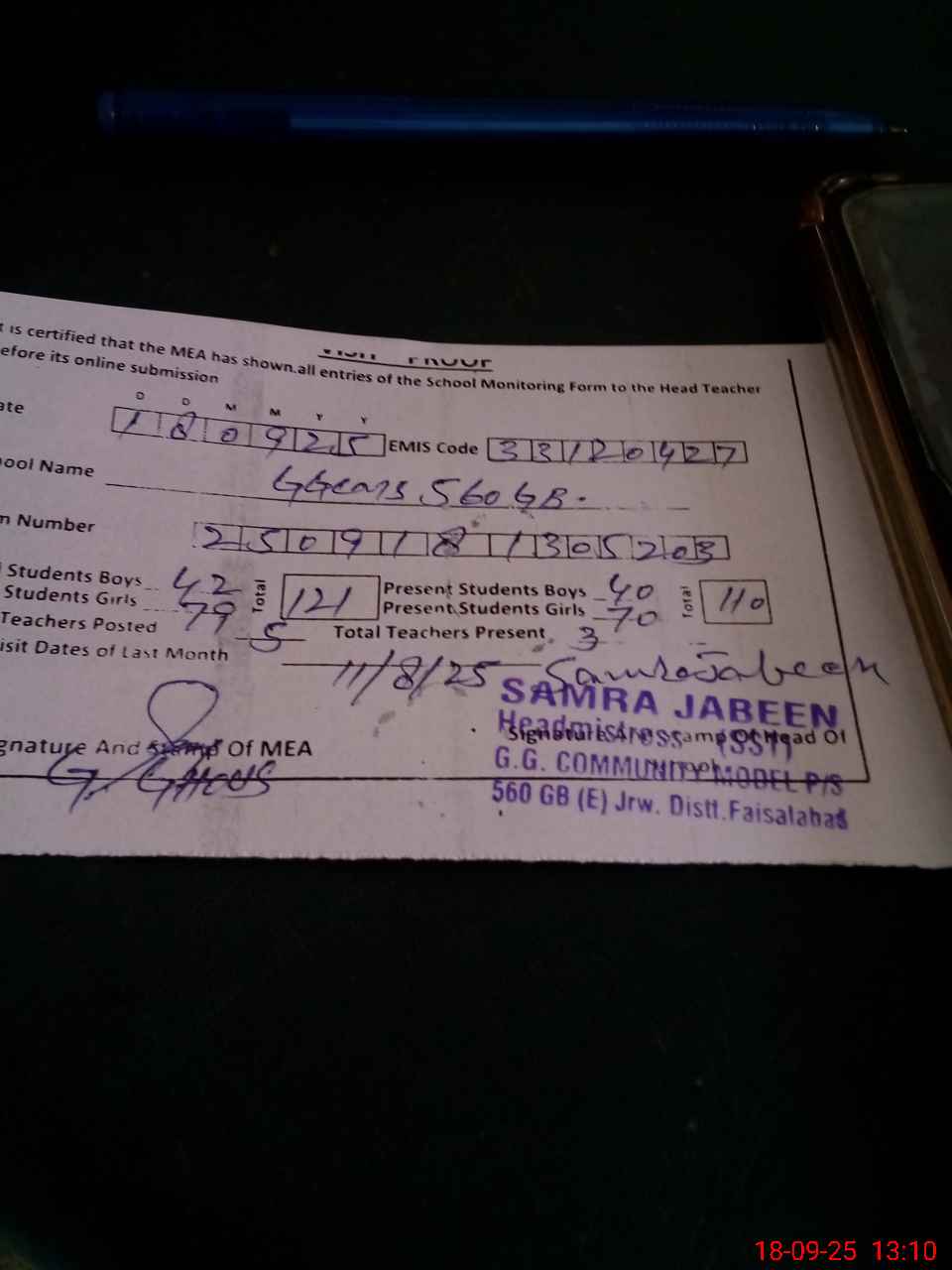| Attendance Register | Head Teacher | MEA with School | Visit Proof |