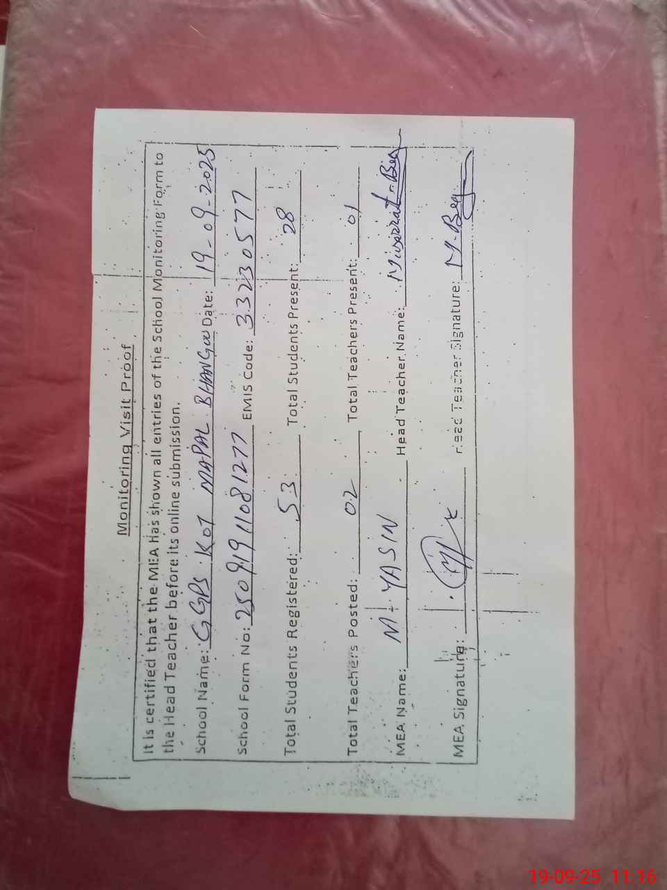 | Attendance Register | Head Teacher | MEA with School | Visit Proof |