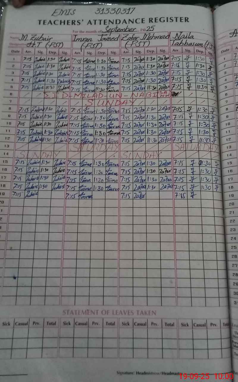 | Name: M.**** Designation: (School Headmaster's/Headmistress's) PST (SCI-MATH) Phone/Cell Number: 03**** |