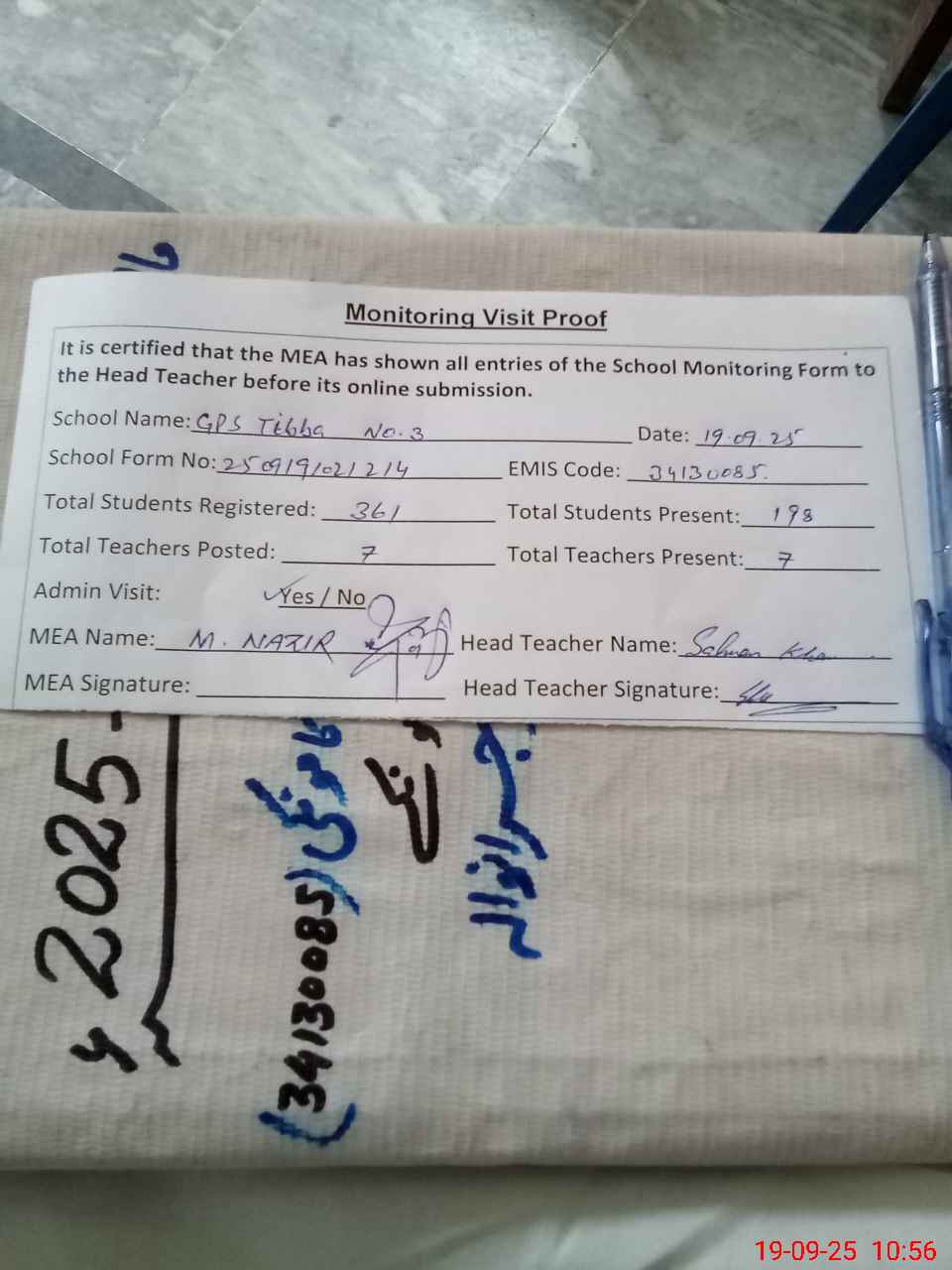 | Attendance Register | Head Teacher | MEA with School | Visit Proof |