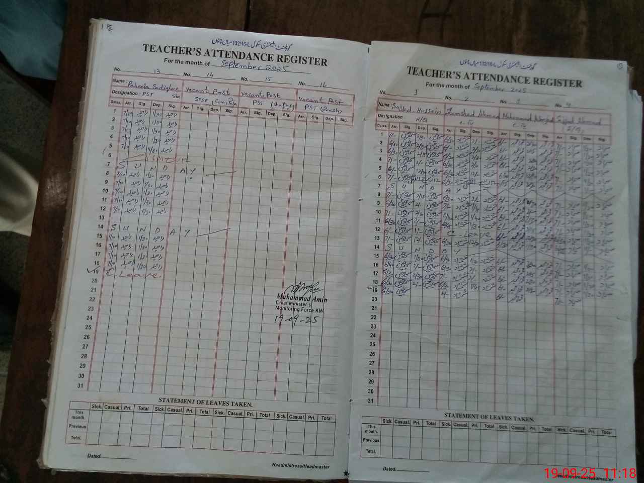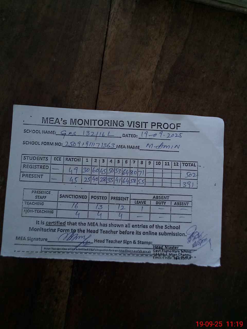 | Attendance Register | Head Teacher | MEA with School | Visit Proof |