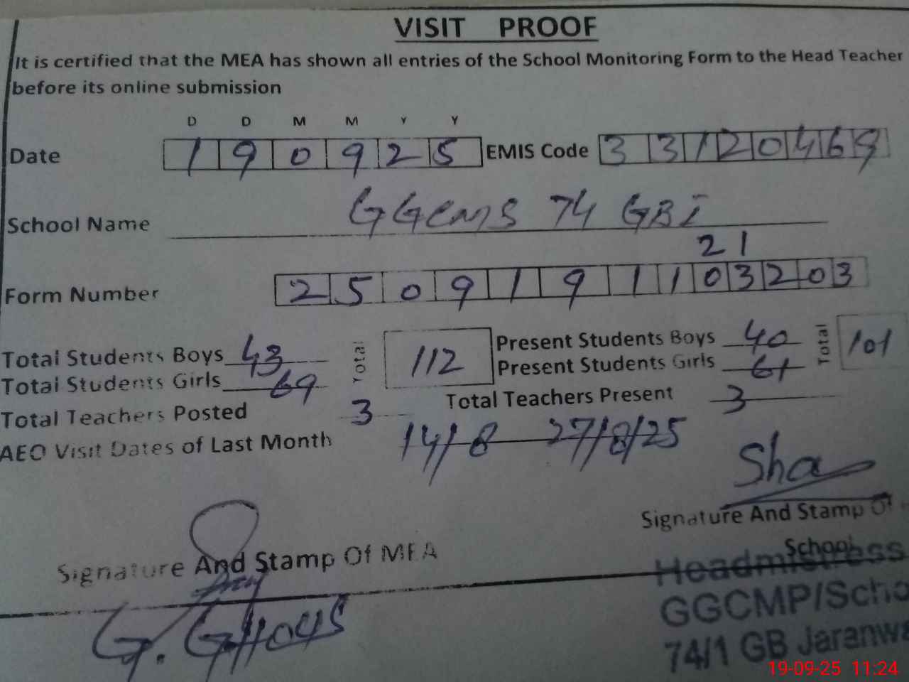 | Attendance Register | Head Teacher | MEA with School | Visit Proof |