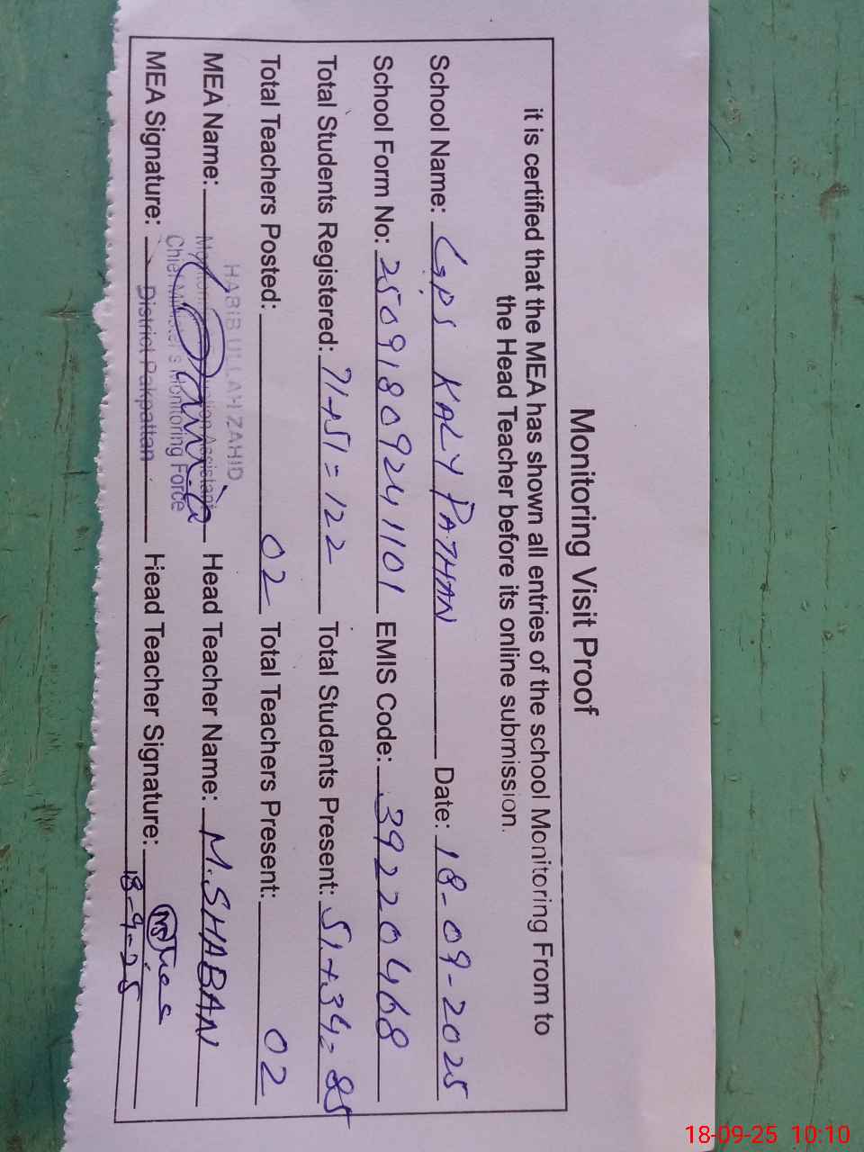 | Attendance Register | Head Teacher | MEA with School | Visit Proof |