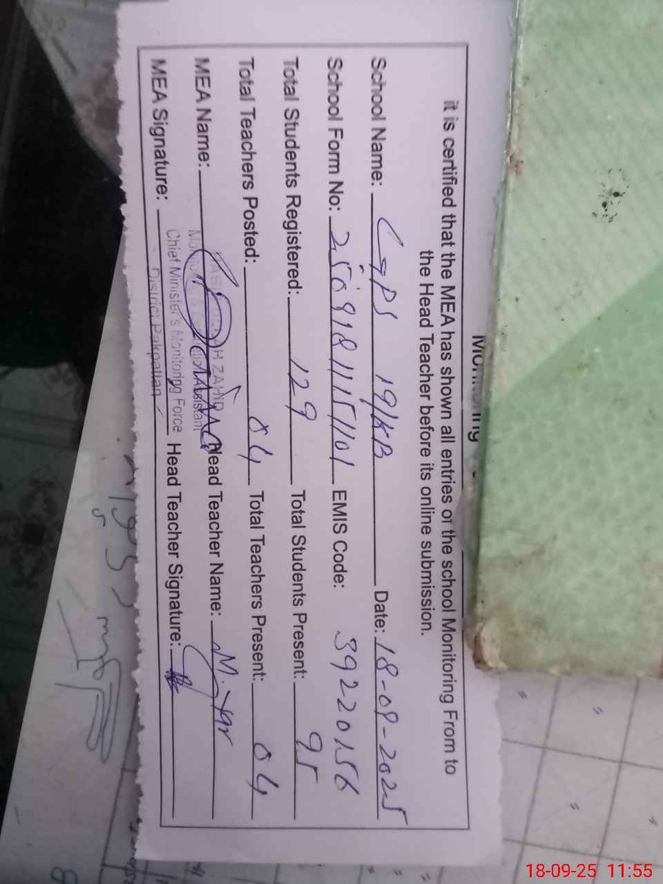 | Certified that this School was Inspected by the Undersigned MEA/DMO Today and the Information Stated Above is as Per Record. | |||||