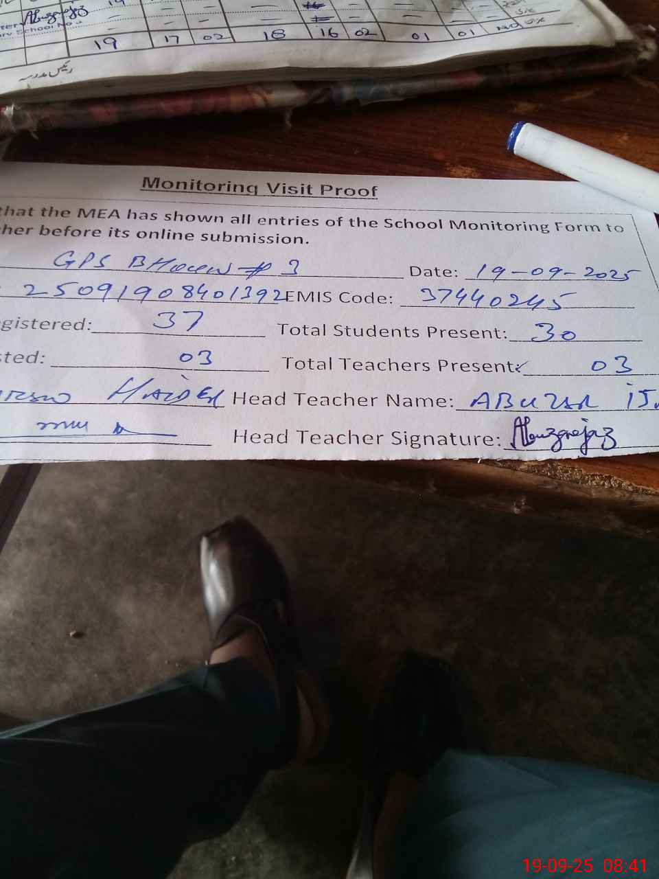 | Attendance Register | Head Teacher | MEA with School | Visit Proof |