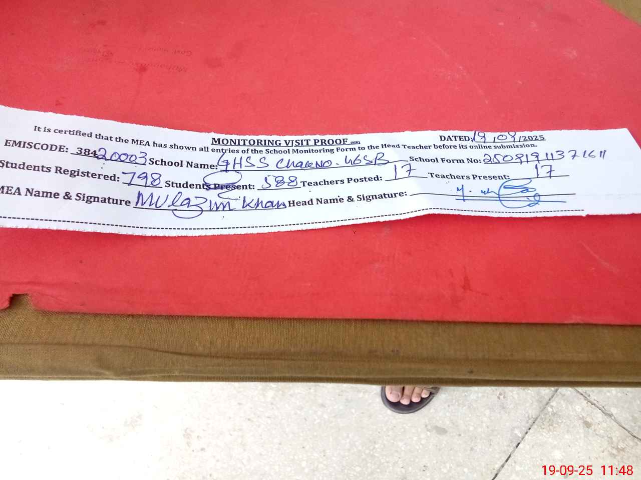 | Attendance Register | Head Teacher | MEA with School | Visit Proof |