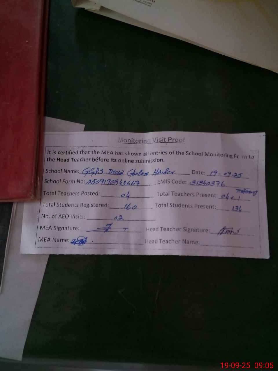 | Attendance Register | Head Teacher | MEA with School | Visit Proof |