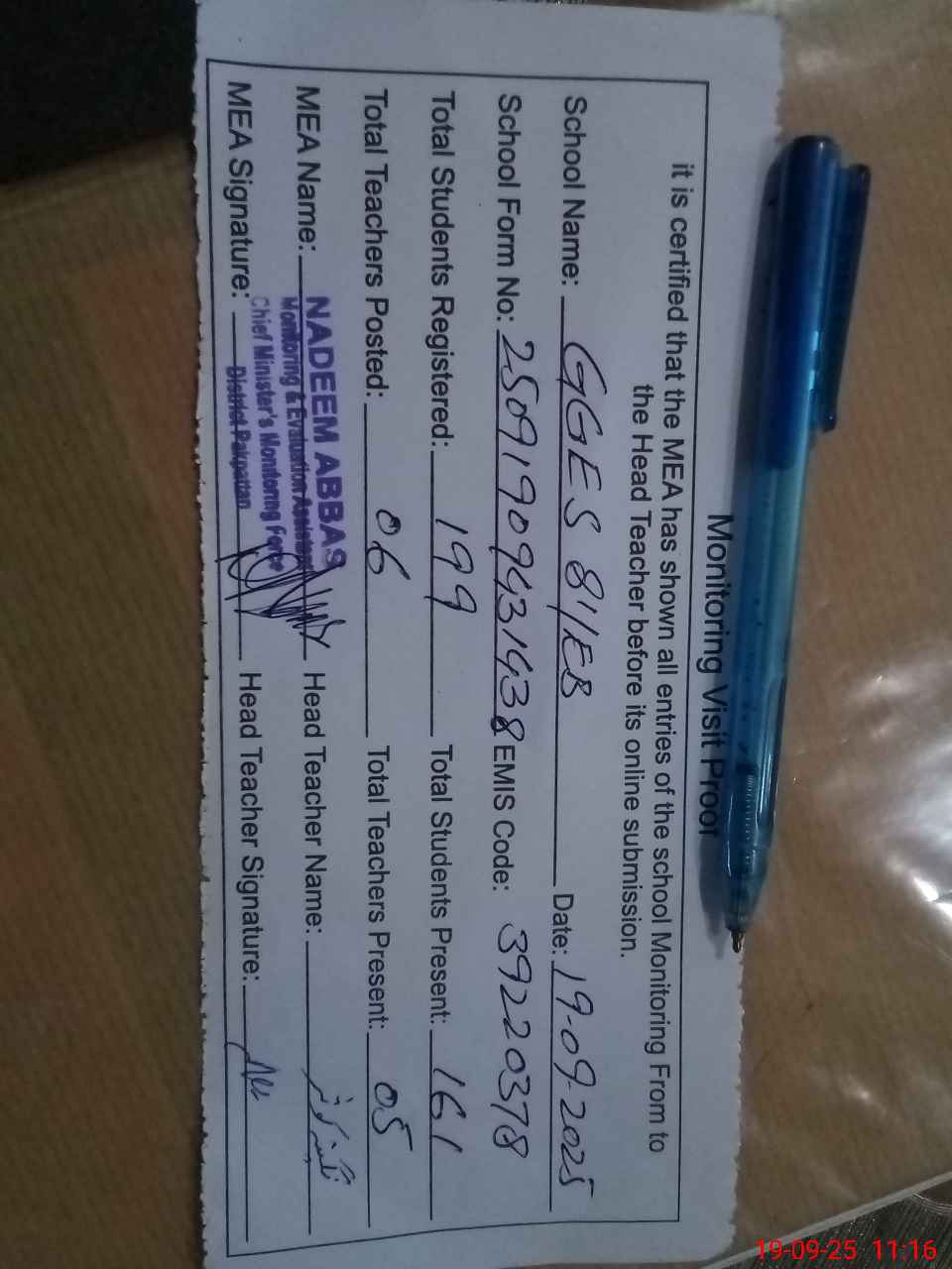| Attendance Register | Head Teacher | MEA with School | Visit Proof |