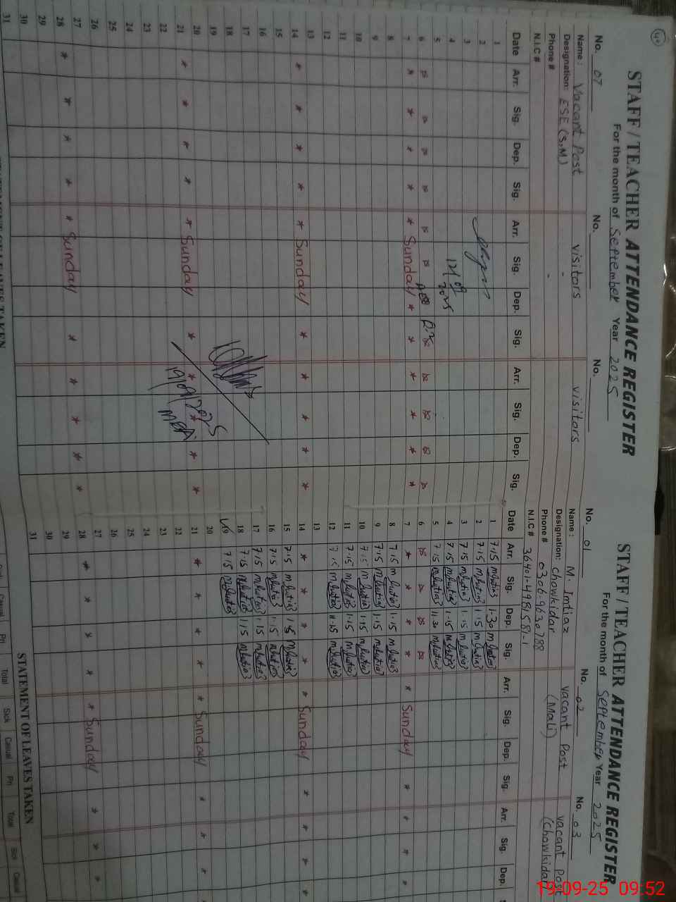 | CNIC | Full Name | Designation | R/C | Absence During Last Calender Month |