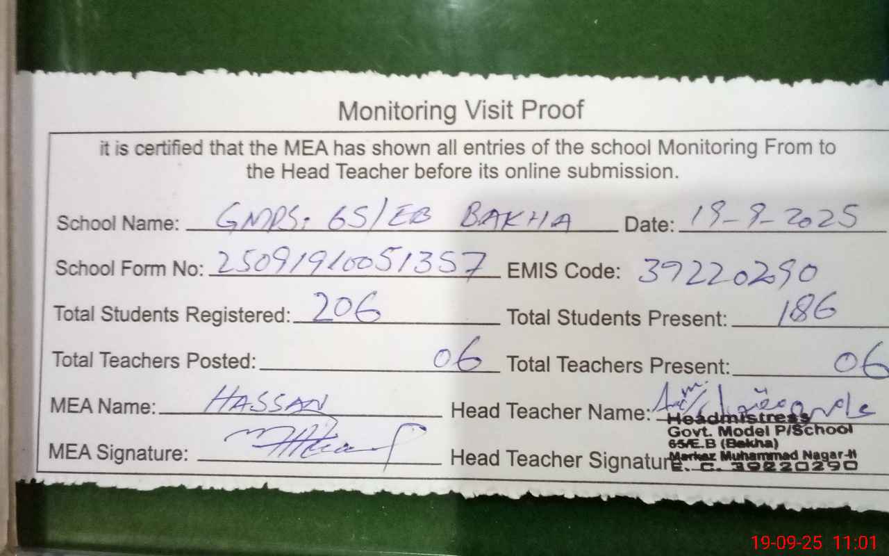 | EMIS Code: 39220290 | Name of School: GMPS 65 EB BAKHA P/O ARIFWALA PAKPATTAN | |||