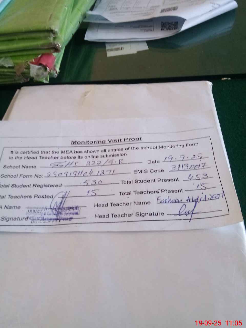 | Attendance Register | Head Teacher | MEA with School | Visit Proof |