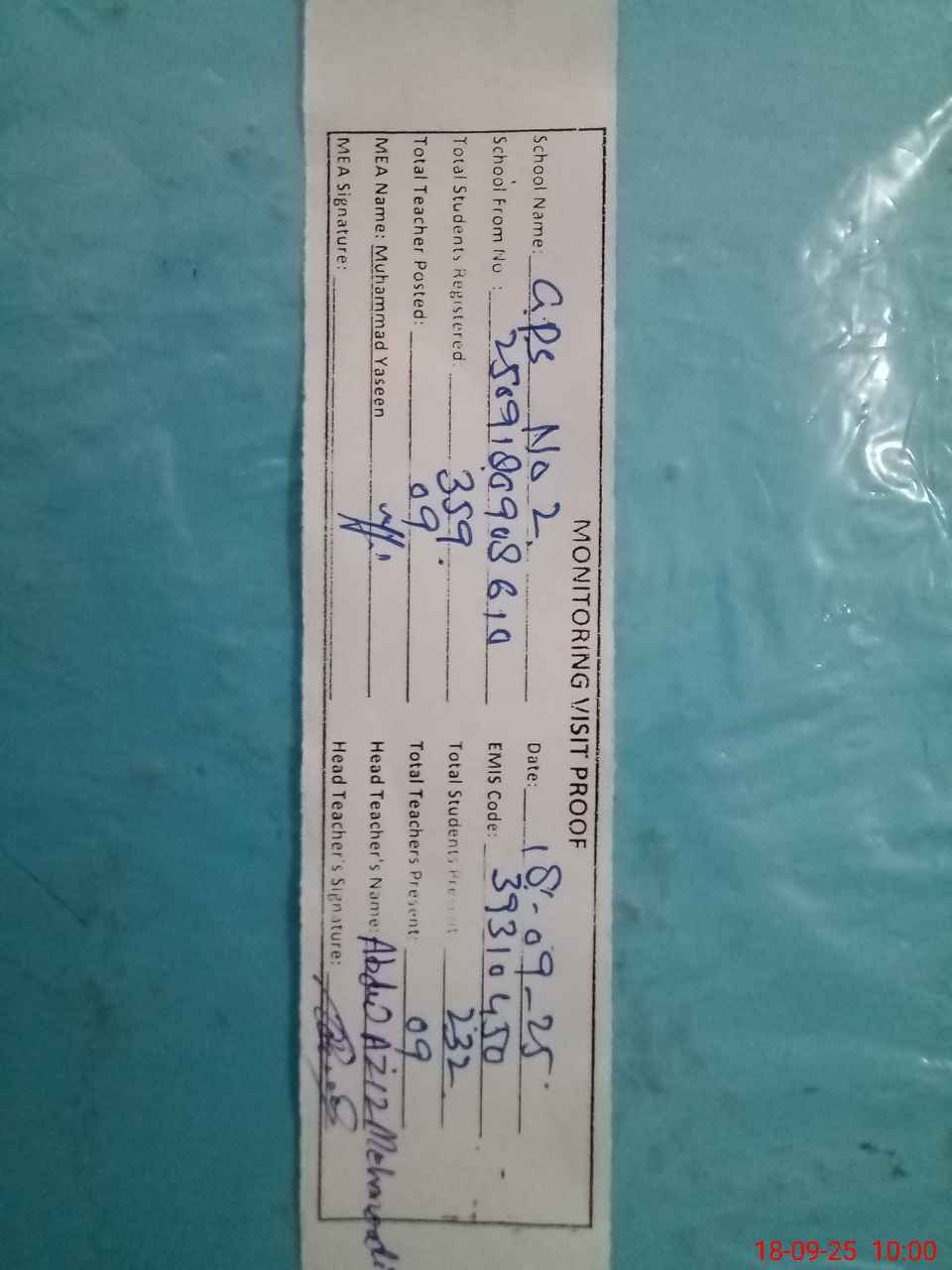| Attendance Register | Head Teacher | MEA with School | Visit Proof |