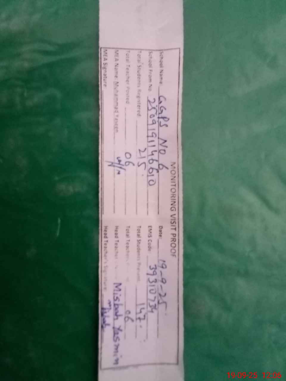 | Attendance Register | Head Teacher | MEA with School | Visit Proof |