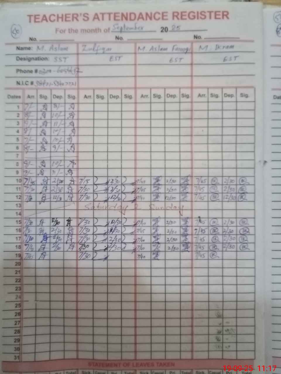 | CNIC | Full Name | Designation | R/C | Absence during last cal. month |