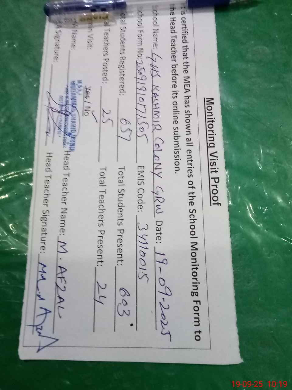 | Attendance Register | Head Teacher | MEA with School | Visit Proof |