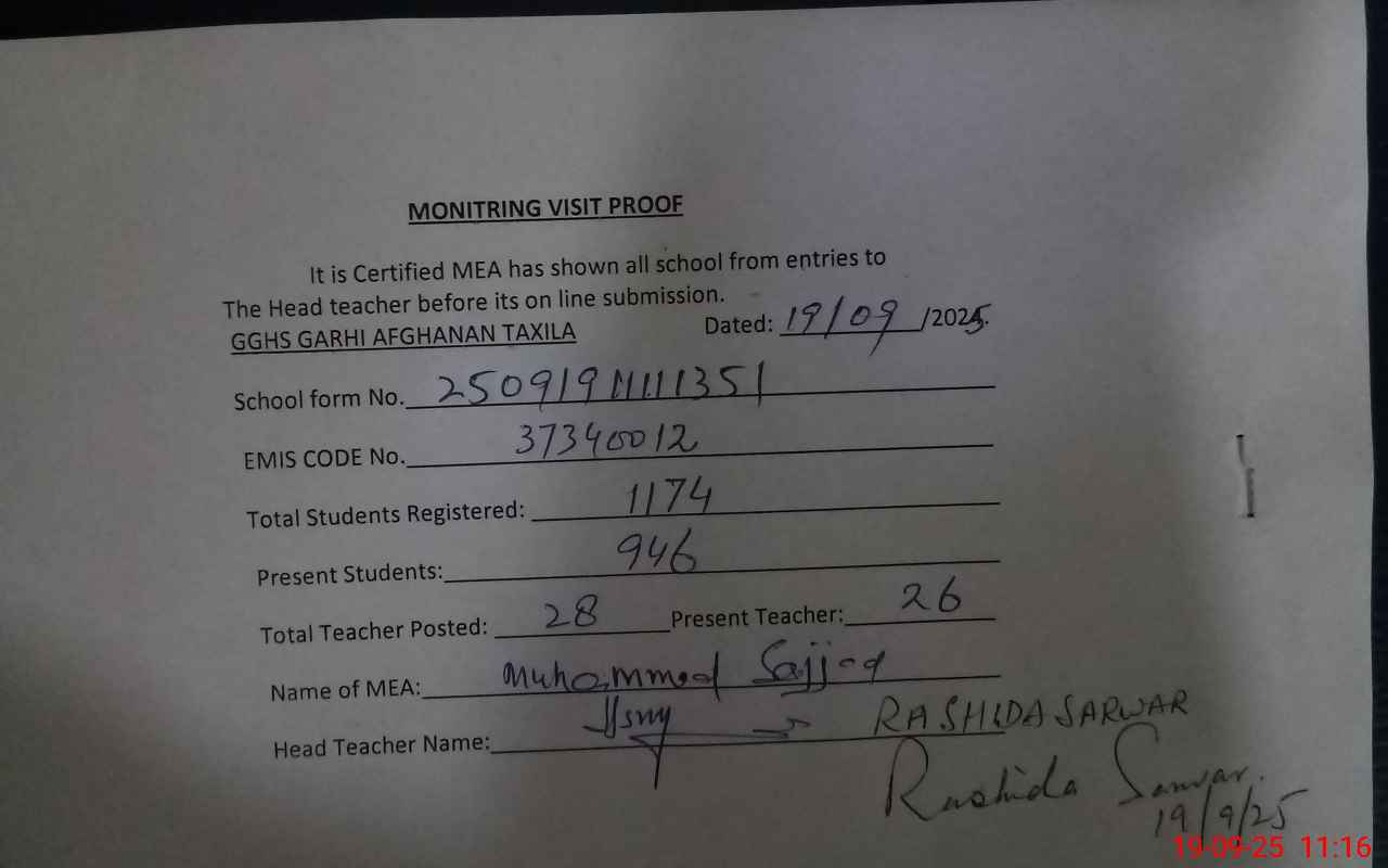 | EMIS Code: 37340012 | Name of School: GGHS GHARI AFGHANAN | |||