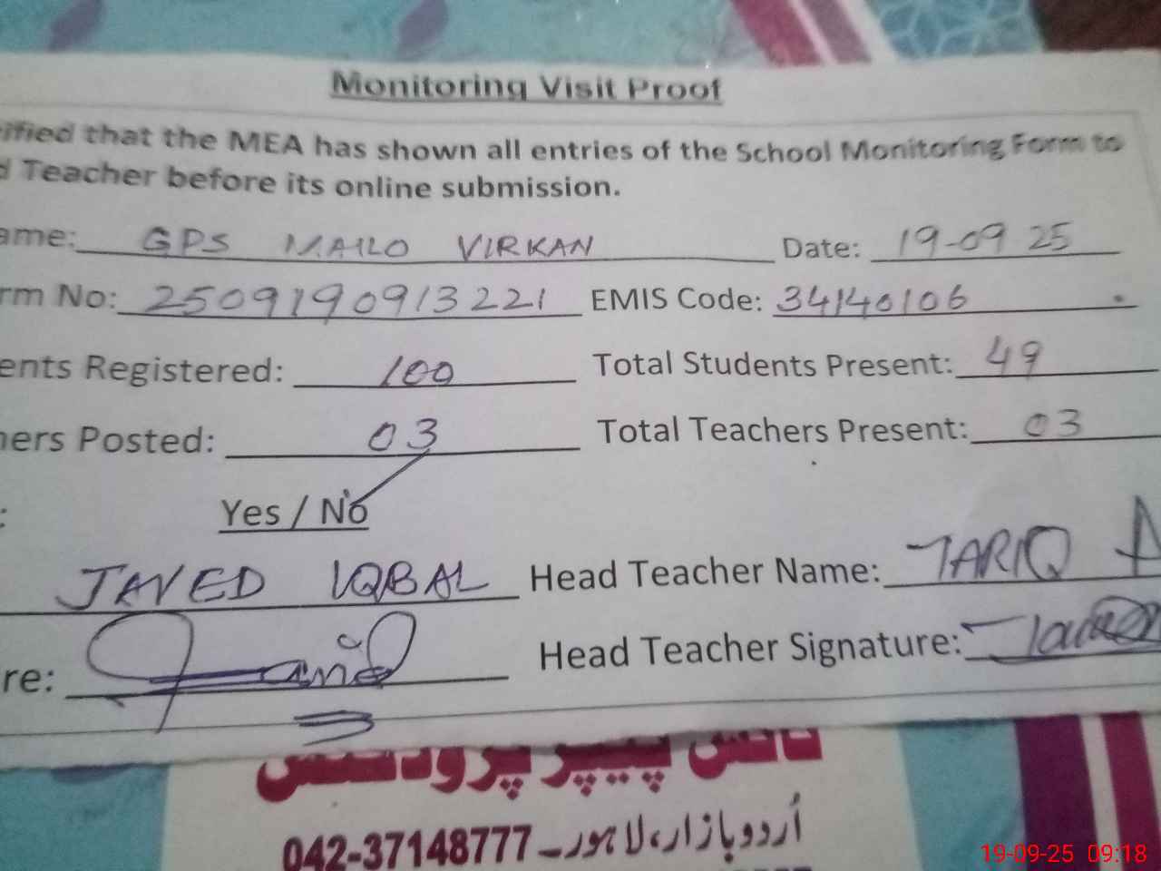 | Name: Fa**** Iq**** Designation: (School Headmaster's/Headmistress's) PST Phone/Cell Number: 03**** |