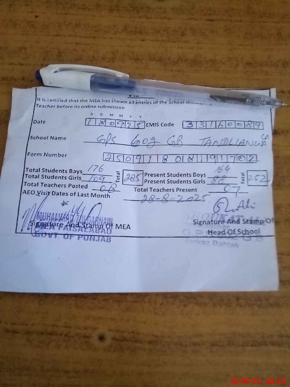 | Attendance Register | Head Teacher | MEA with School | Visit Proof |