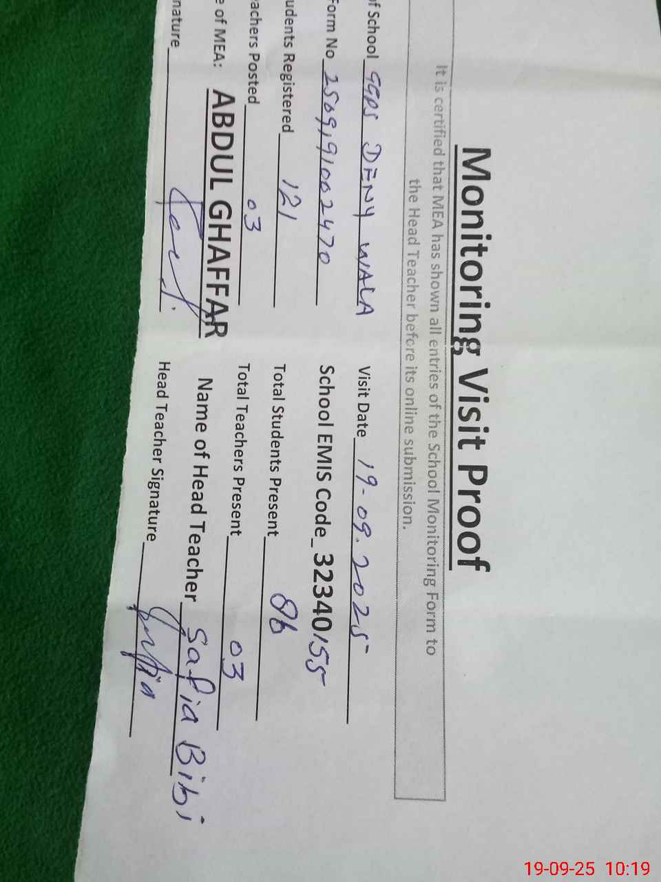 | Certified that this School was Inspected by the Undersigned MEA/DMO Today and the Information Stated Above is as Per Record. | |||||
