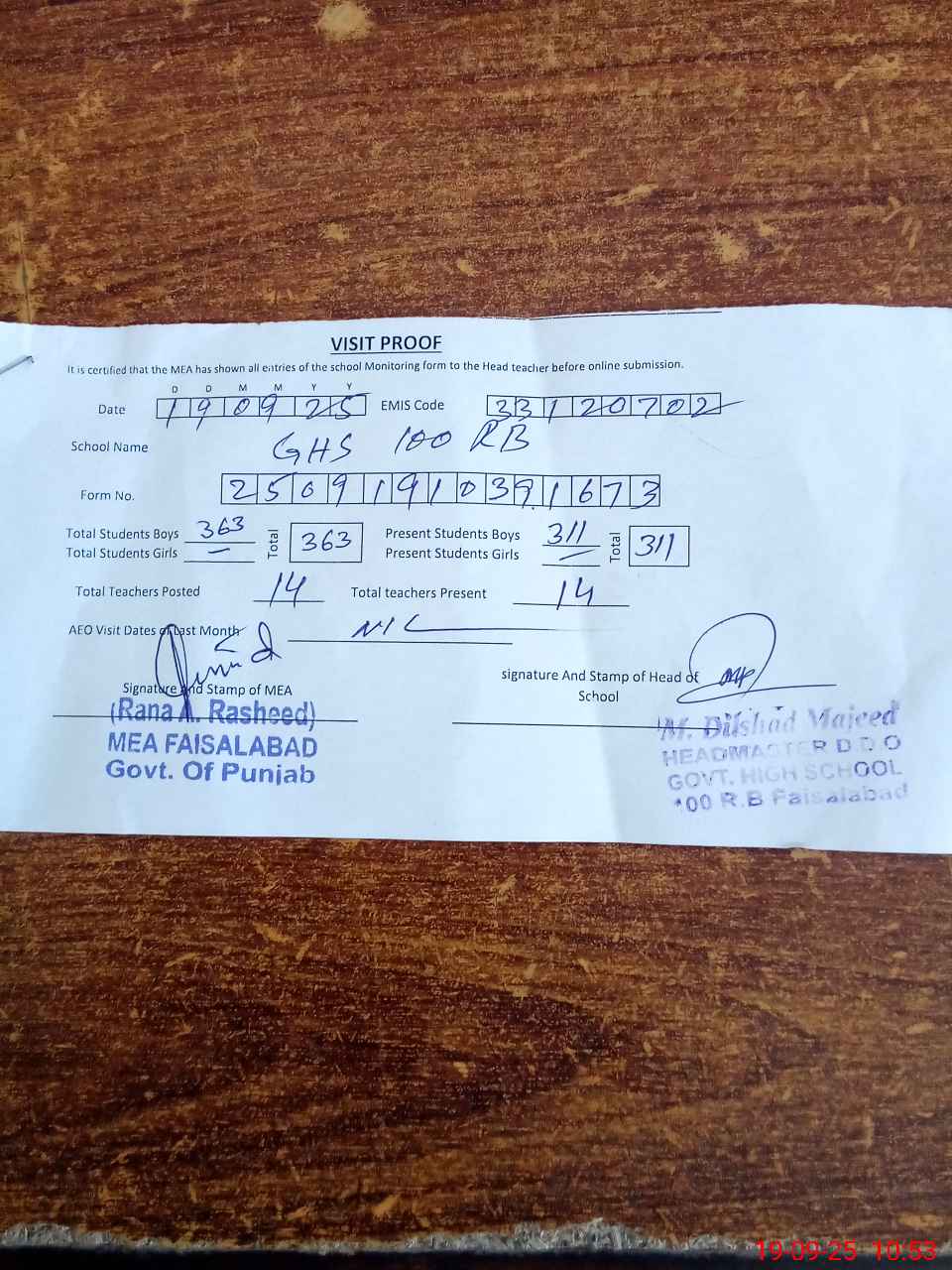 | Certified that this School was Inspected by the Undersigned MEA/DMO Today and the Information Stated Above is as Per Record. | |||||