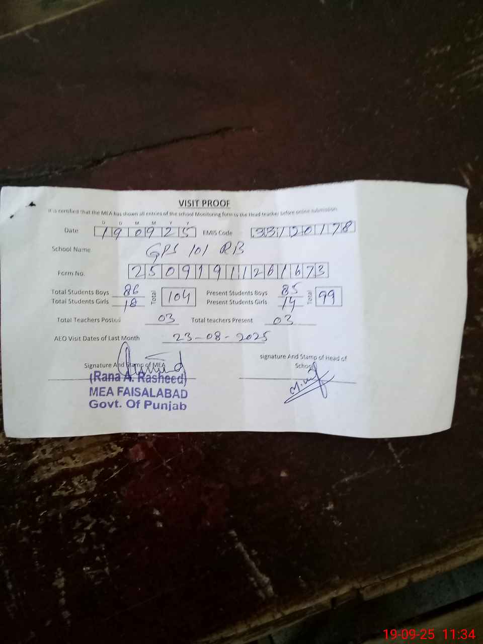 | EMIS Code: 33120178 | Name of School: GPS CHAK 101 RB I | |||