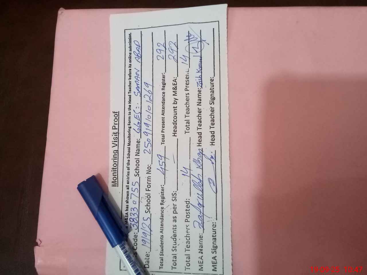 | Attendance Register | Head Teacher | MEA with School | Visit Proof |