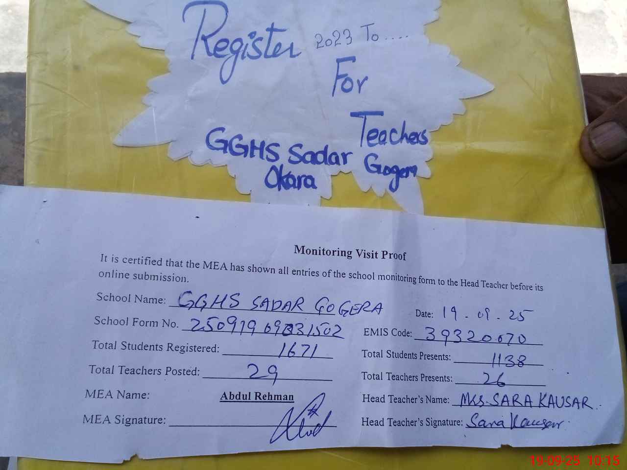 | Attendance Register | Head Teacher | MEA with School | Visit Proof |