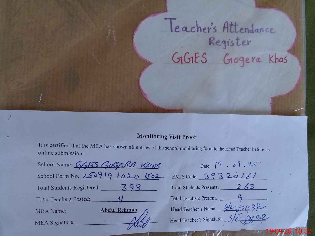 | Attendance Register | Head Teacher | MEA with School | Visit Proof |