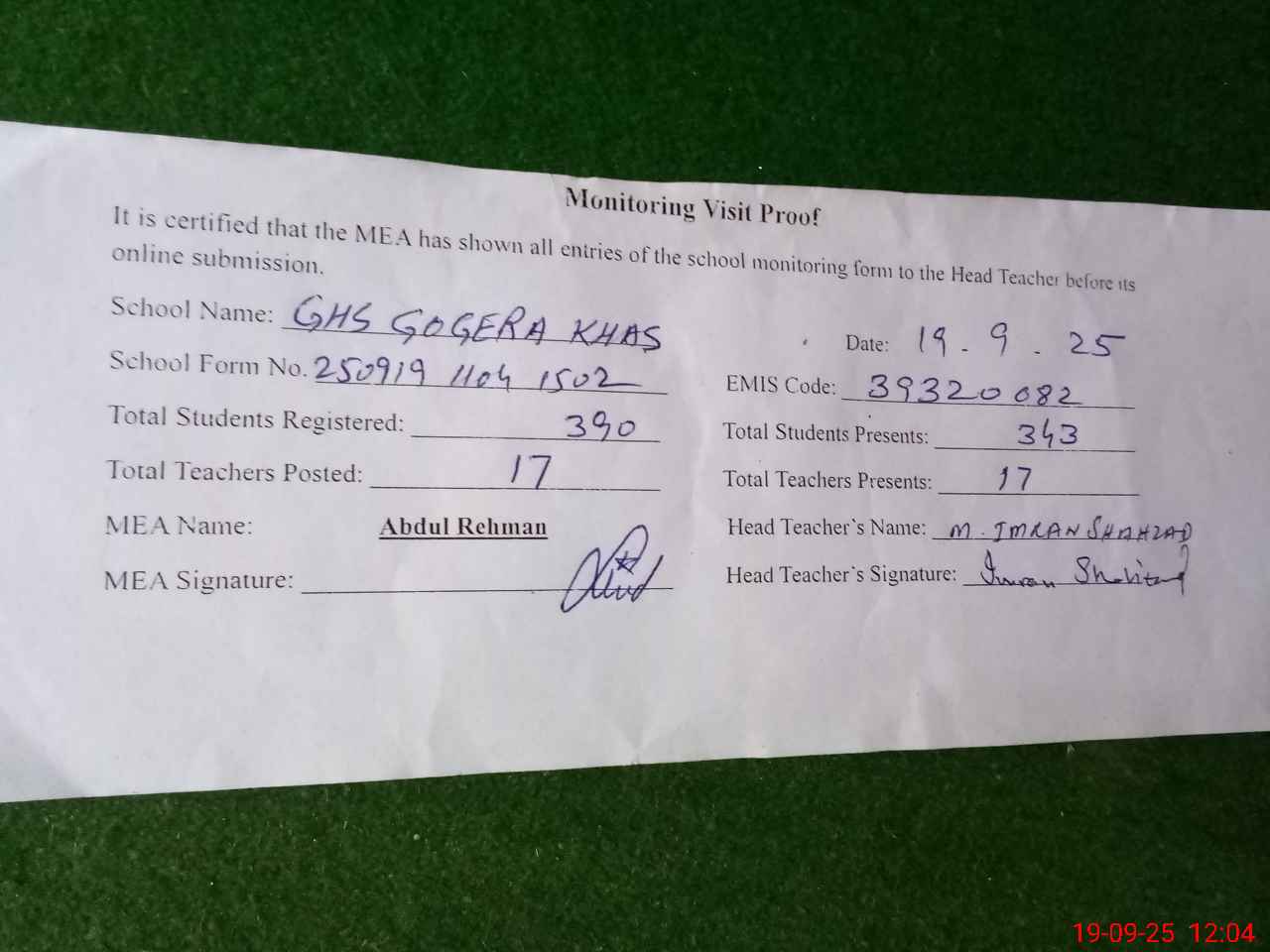 | Attendance Register | Head Teacher | MEA with School | Visit Proof |