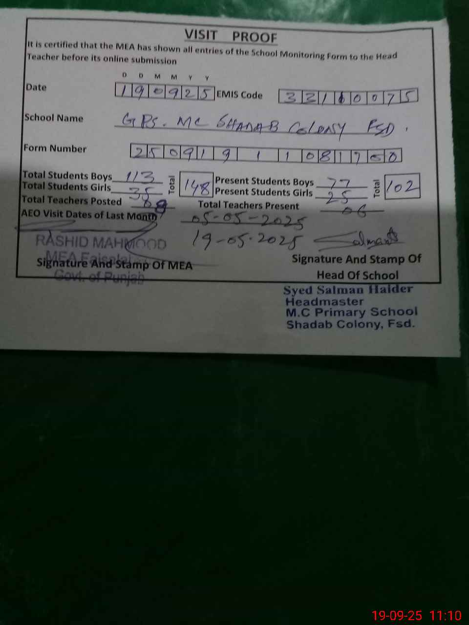 | Attendance Register | Head Teacher | MEA with School | Visit Proof |