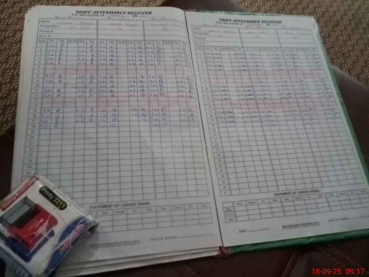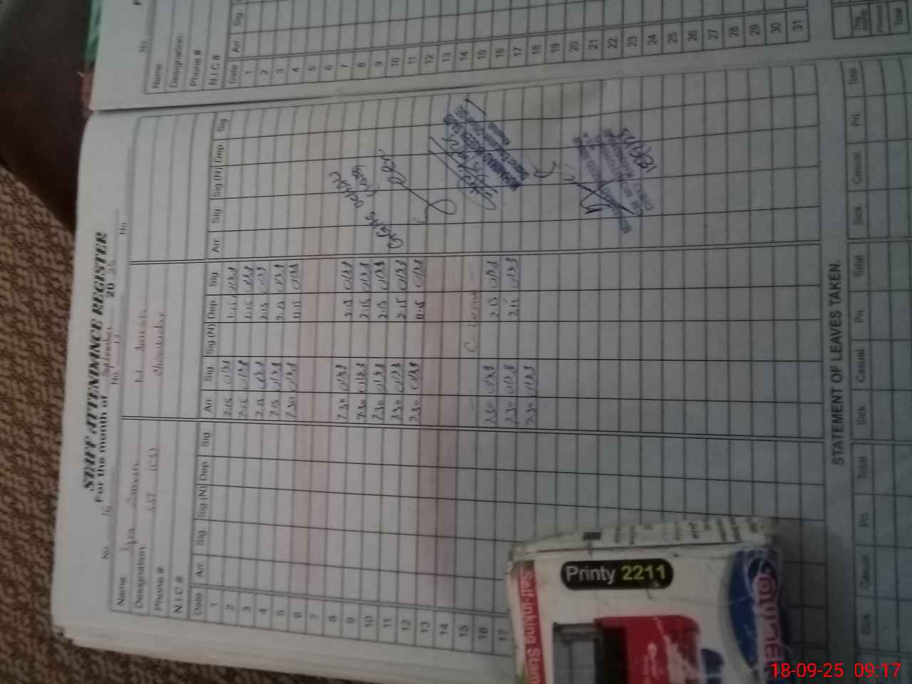 | CNIC | Full Name | Designation | R/C | Absence During Last Calender Month |