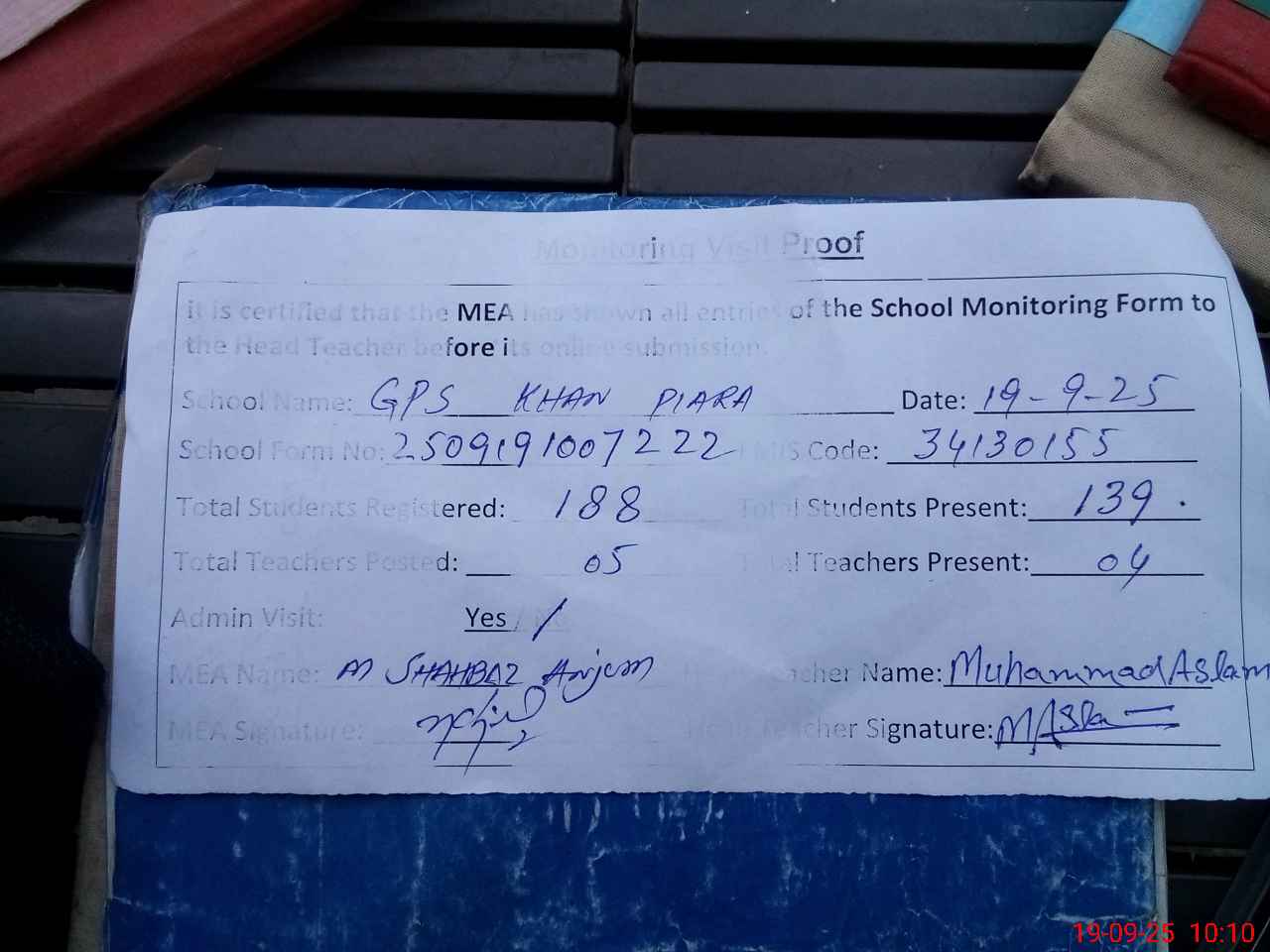| Attendance Register | Head Teacher | MEA with School | Visit Proof |