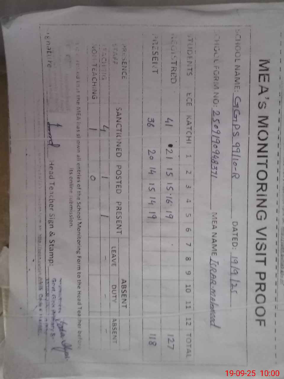 | Attendance Register | Head Teacher | MEA with School | Visit Proof |