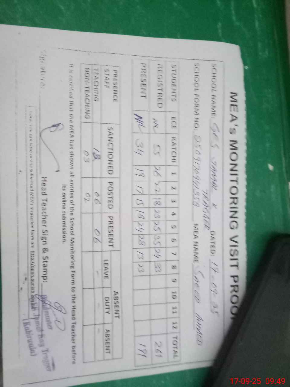 | Attendance Register | Head Teacher | MEA with School | Visit Proof |