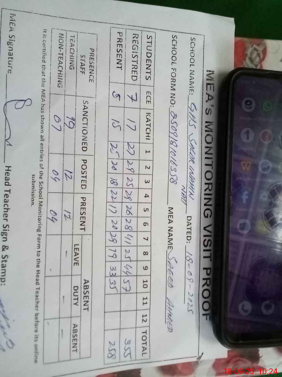 | Attendance Register | Head Teacher | MEA with School | Visit Proof |