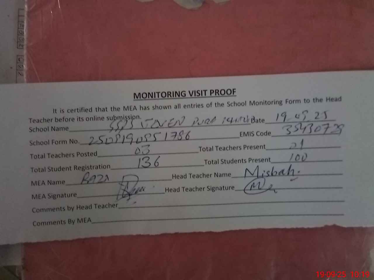 | Attendance Register | Head Teacher | MEA with School | Visit Proof |