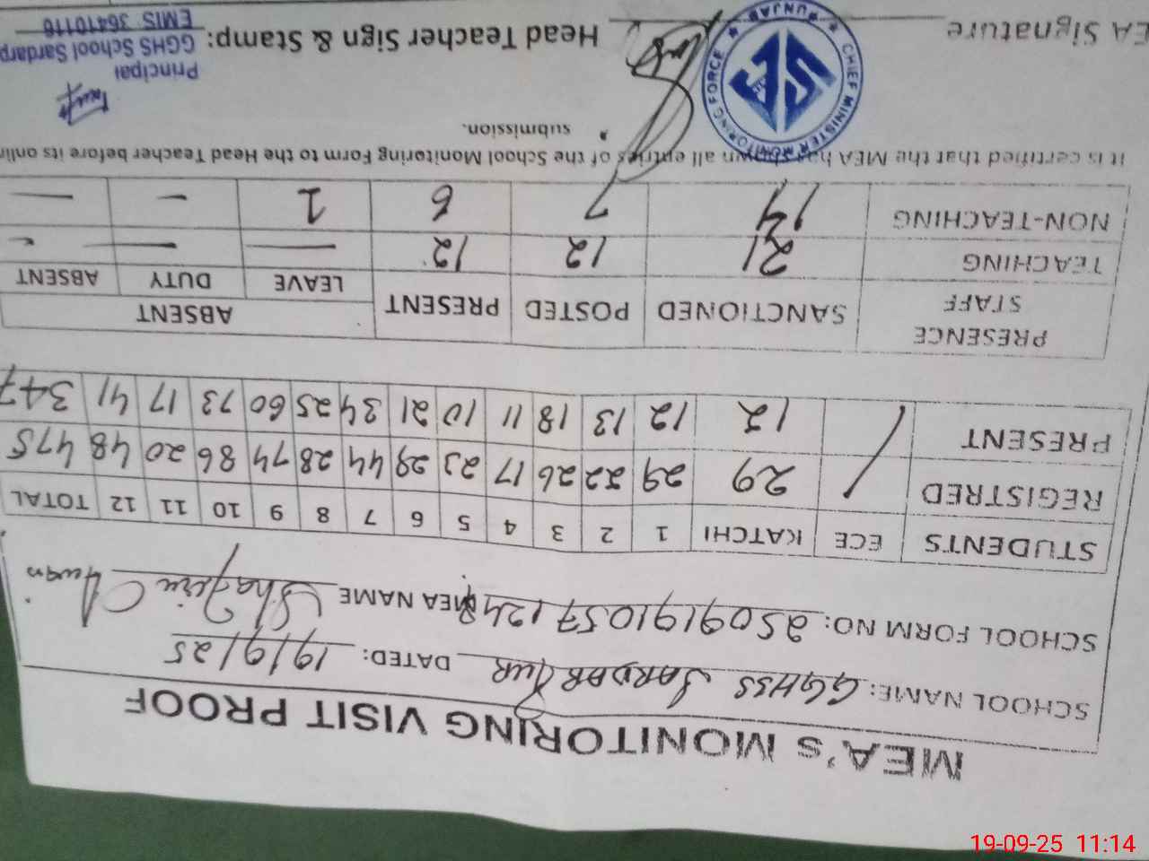 | Attendance Register | Head Teacher | MEA with School | Visit Proof |