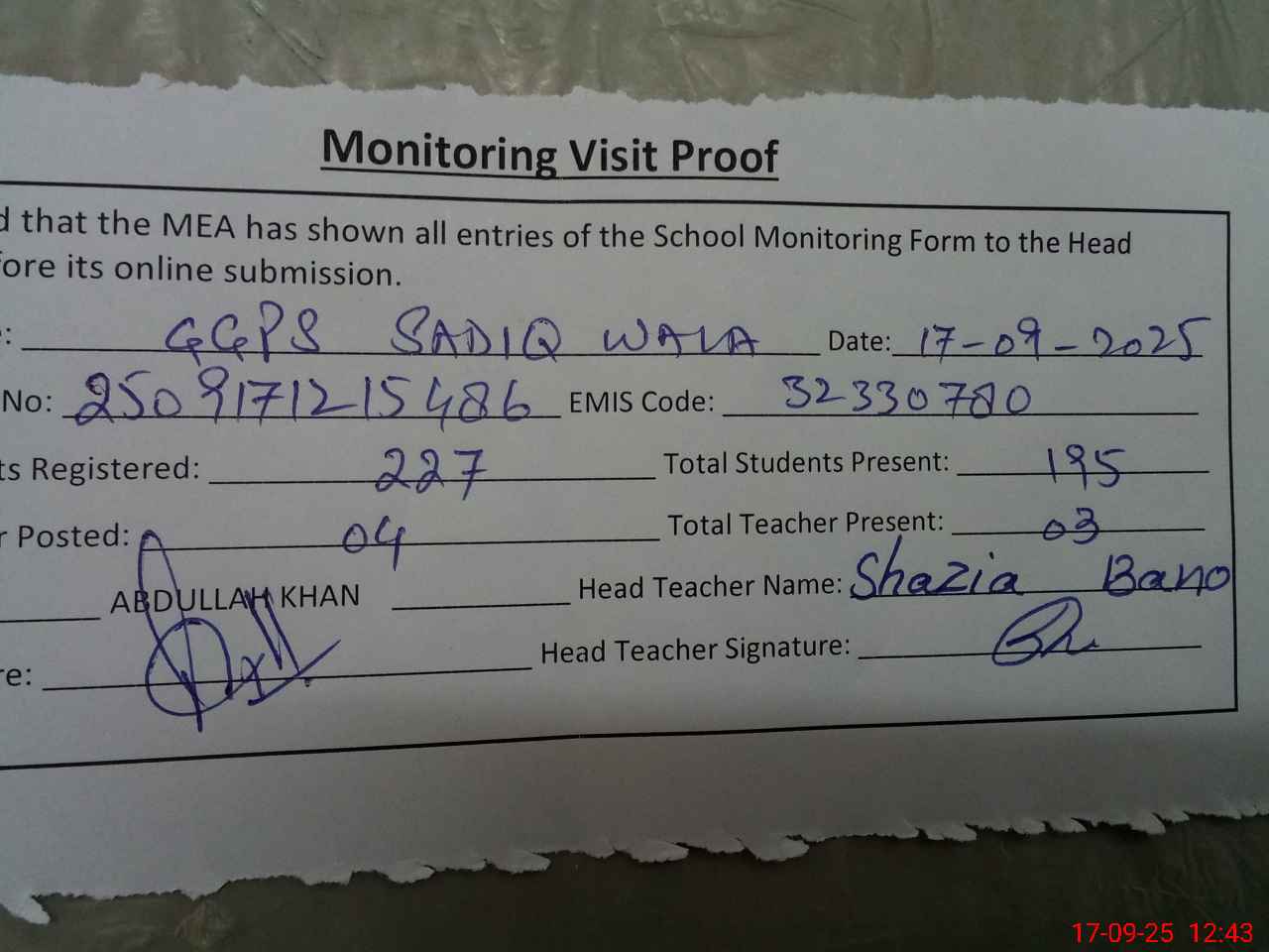 | EMIS Code: 32330780 | Name of School: GGPS SADIQ WALA | |||