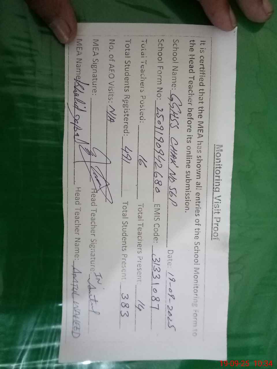 | Attendance Register | Head Teacher | MEA with School | Visit Proof |