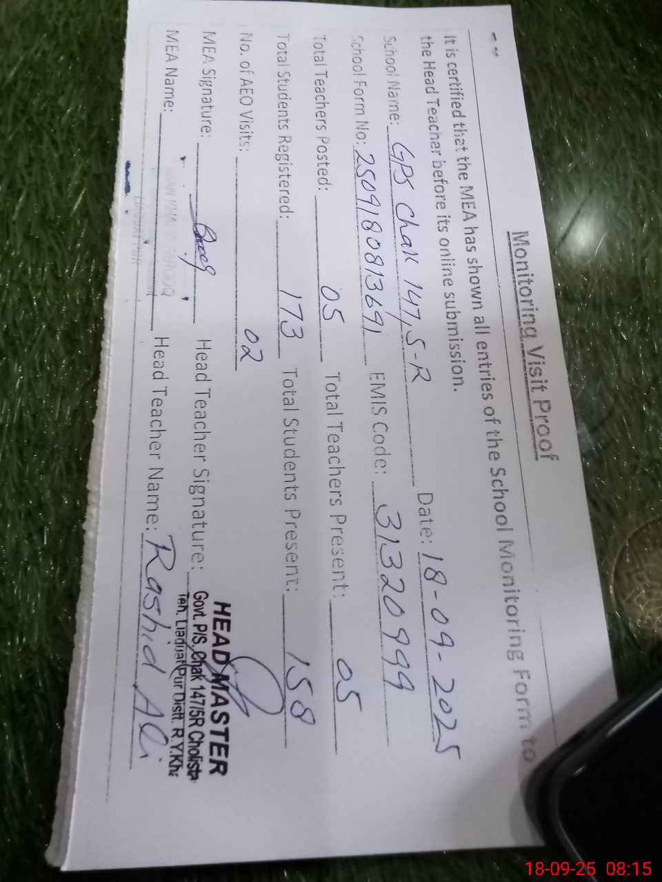 | Name: RA**** AL**** Designation: (School Headmaster's/Headmistress's) EST (Sc) Phone/Cell Number: 03**** |