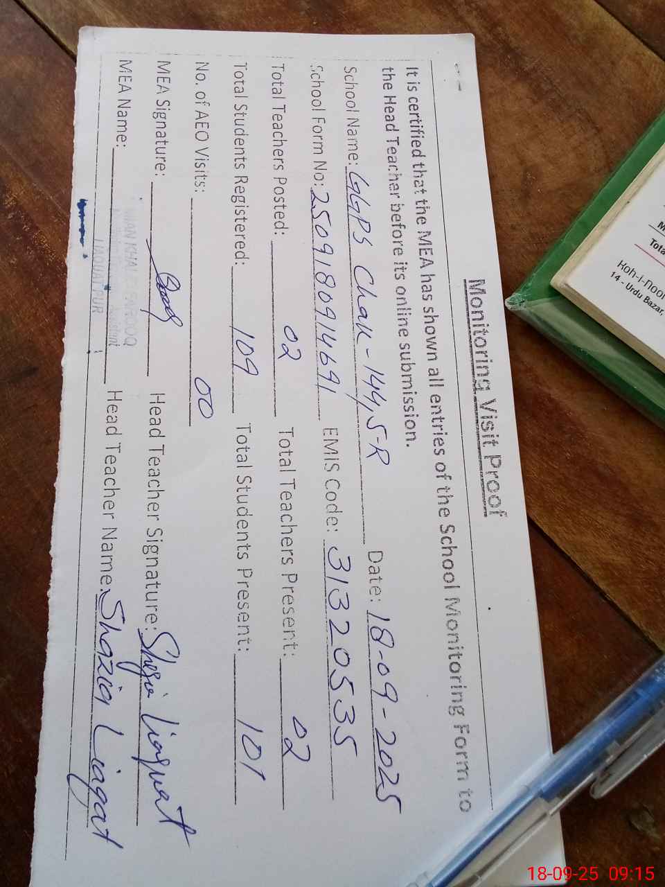 | Attendance Register | Head Teacher | MEA with School | Visit Proof |