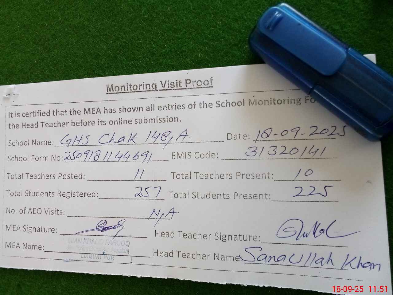 | Attendance Register | Head Teacher | MEA with School | Visit Proof |