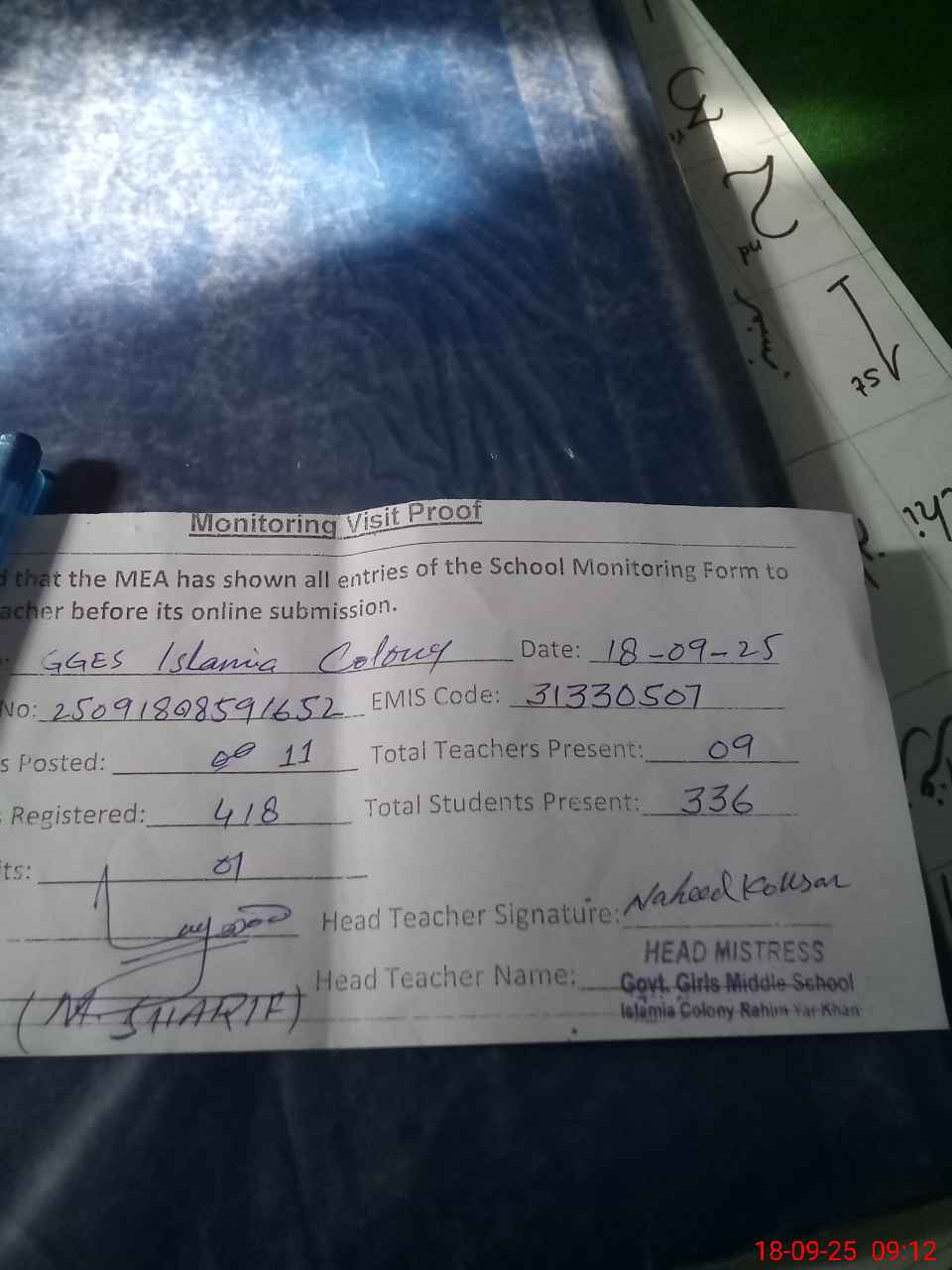 | EMIS Code: 31330507 | Name of School: GGES ISLAMIA COLONY | |||