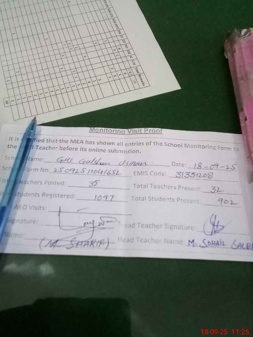 | Attendance Register | Head Teacher | MEA with School | Visit Proof |