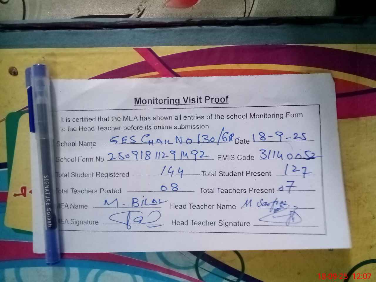 | Attendance Register | Head Teacher | MEA with School | Visit Proof |